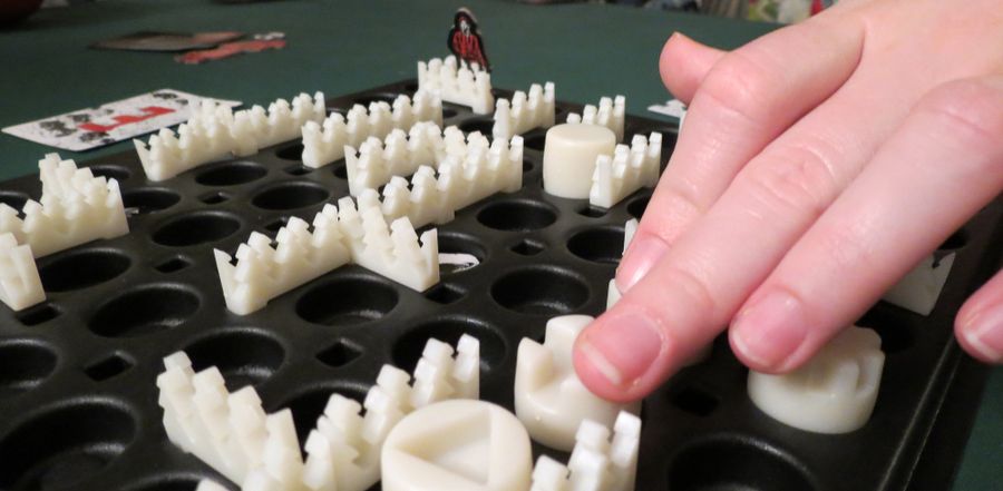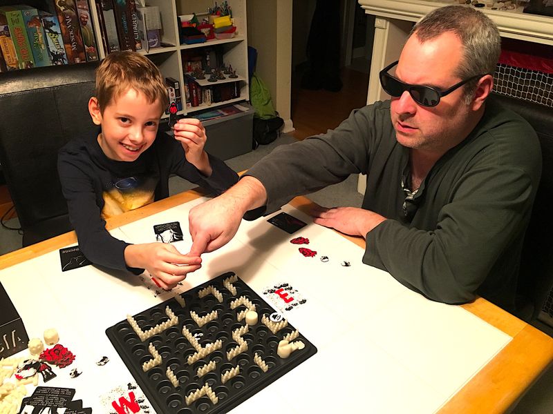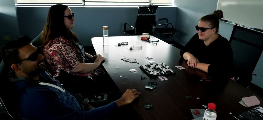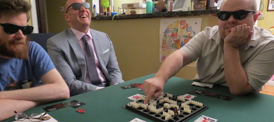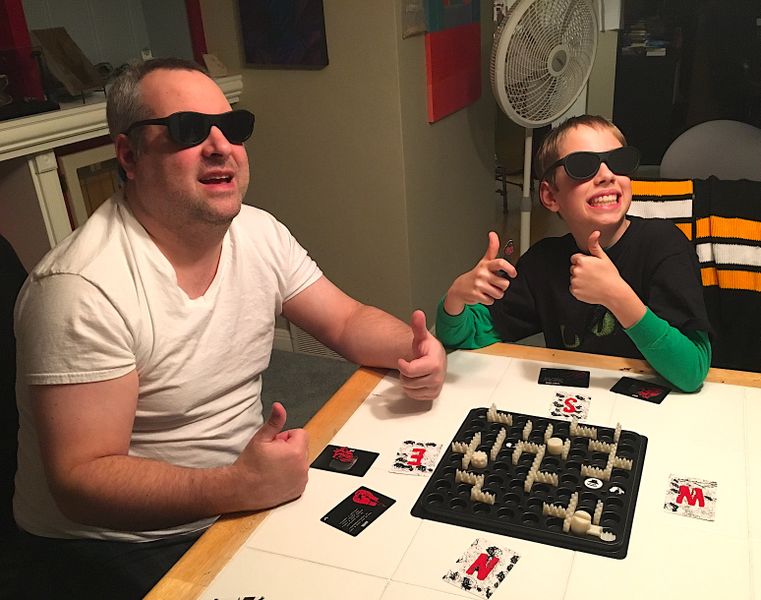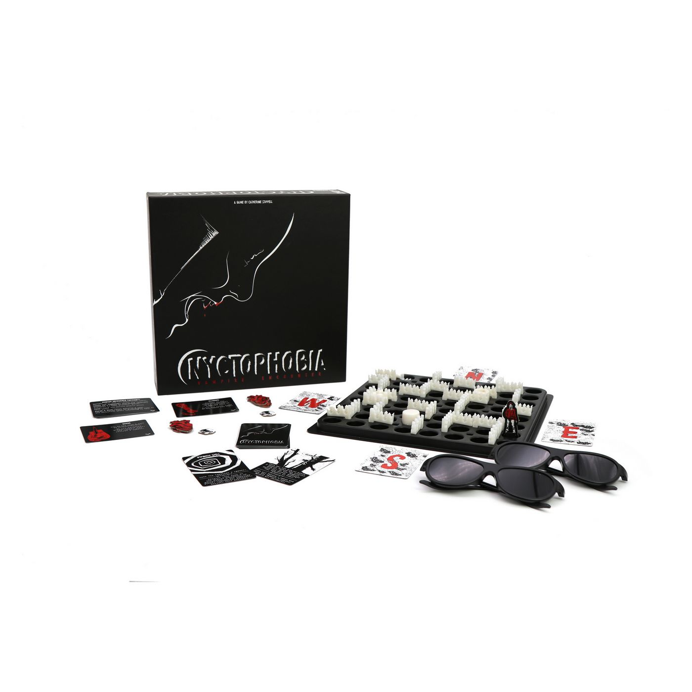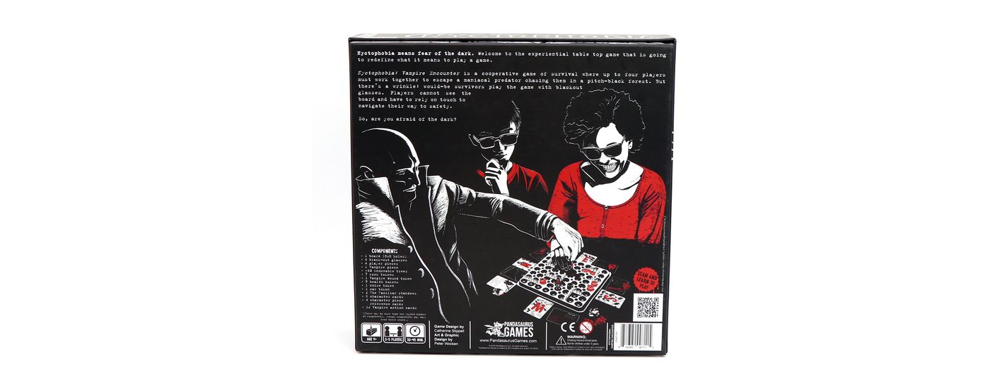 In Nyctophobia: Vampire Encounter, you attempt to outrun and outsmart a vampire who is hunting you. The forest is a dark and lonely place. Players must blindly navigate it while wearing blackout glasses, trying to find and rescue their friend — "the familiar" — who the vampire has kidnapped and hidden in the forest. Only the vampire can see what's going on around them. The hunted players have the navigate the board through touch and memory only!
