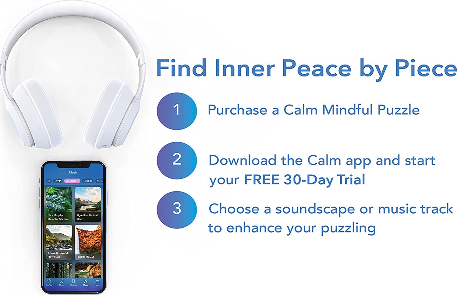 - Inclui: 300 peças de quebra-cabeça, bolsa de armazenamento de tecido, teste de 30 dias para o aplicativo calmo